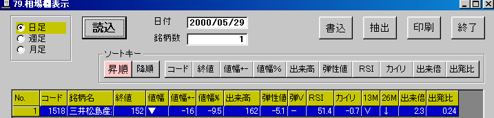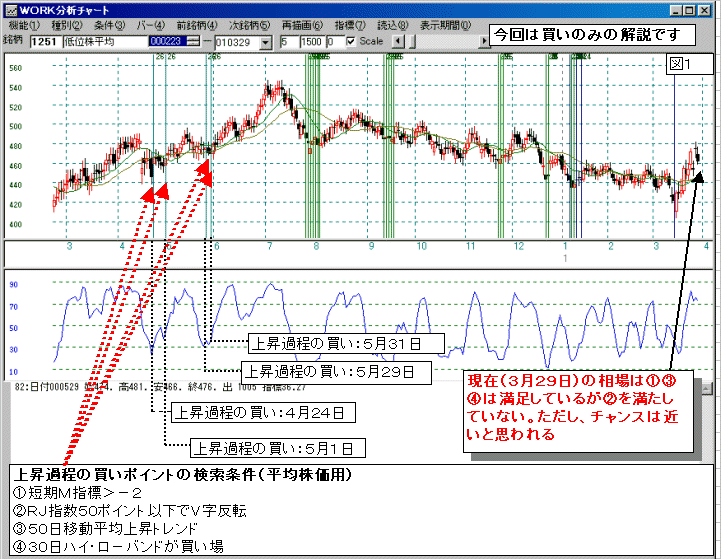 | ◆便宜的に上にあるように、平均株価の50日移動平均が上げトレンドであり、30日周期のハイ・ロ−バンドが買い場になって相場が上昇基調にあると規定してしまいます。 (現実の相場が上げ相場になるか、その時点から方向を逆転するか事後的にしか分かりませんがシステム売買の基本は人為的な予想を排除し、一定の条件下では一定の行動をとることが大前提となっています。) |