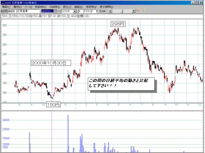 | 単に安いところを買うという全く単純な手法であるが、平均株価が一貫して値下がりしている時期にみごとに上昇銘柄を選んでいる点に注目して頂きたい。 |